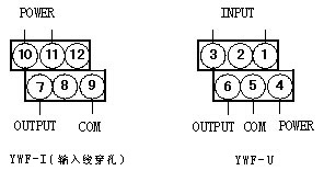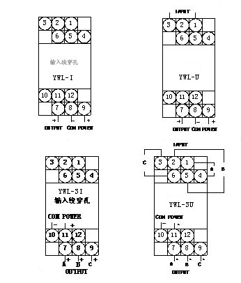 注: 1、YWF、YWL系列交流電流變送器輸入線從變送器外殼設(shè)置的穿孔穿過(guò),不分極性。